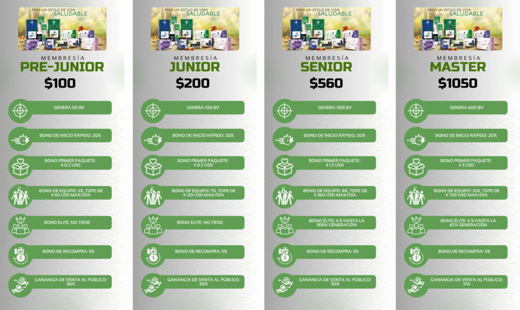 Para comenzar en el Plan de Ganancia Mutua de HGW, es necesario obtener una de las 4 membresías iniciales: Pre-Junior, Junior, Senior y Master. Estas membresías te permitirán integrarte al negocio en toda Latinoamérica y el mundo. Cada una ofrece características específicas orientadas a la generación de ingresos y crecimiento dentro del proyecto.